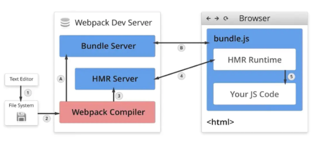 - 在HMR Runtime 和 HMR Server之间建立 websocket,即图上4号线,用于实时更新文件变化