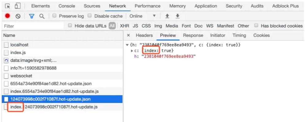 - 当 socket server 监听到对应的模块发生变化时,会生成两个文件.json(manifest文件)和.js文件(update chunk)