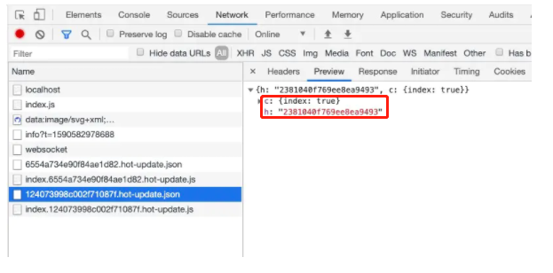 由于socket服务器在HMR Runtime 和 HMR Server之间建立 websocket链接,当文件发生改动的时候,服务端会向浏览器推送一条消息,消息包含文件改动后生成的hash值,如下图的h属性,作为下一次热更细的标识